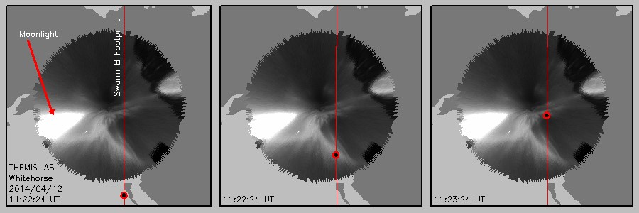 Swarm B overflight of the Whitehorse THEMIS-ASI on April 12, 2014. The successive images shown are separated by one minute in time, contaminated in the west by light from the recently-set Sun, and show Patchy Pulsating Aurora, part of an Omega Band, and an Auroral Torch